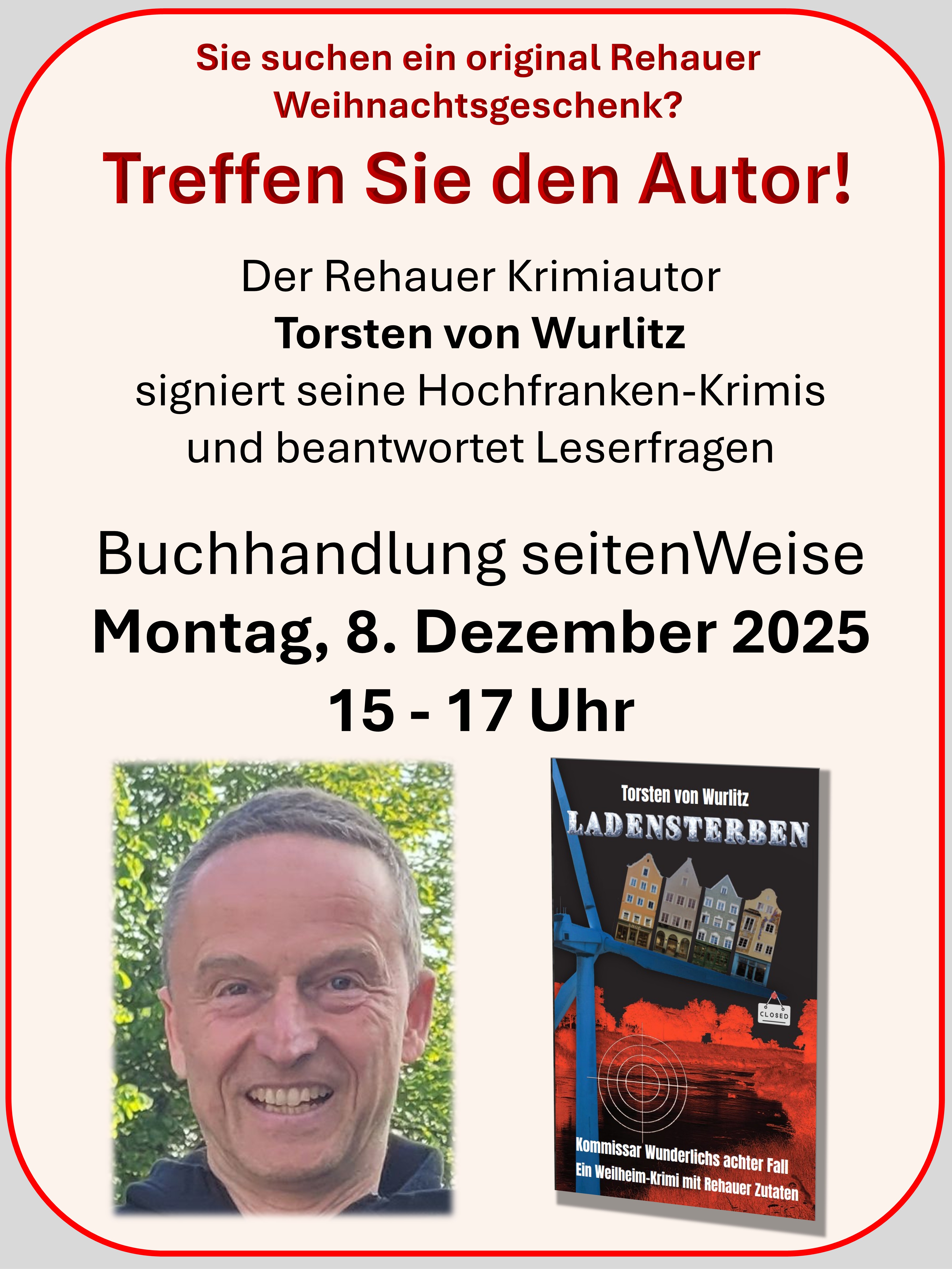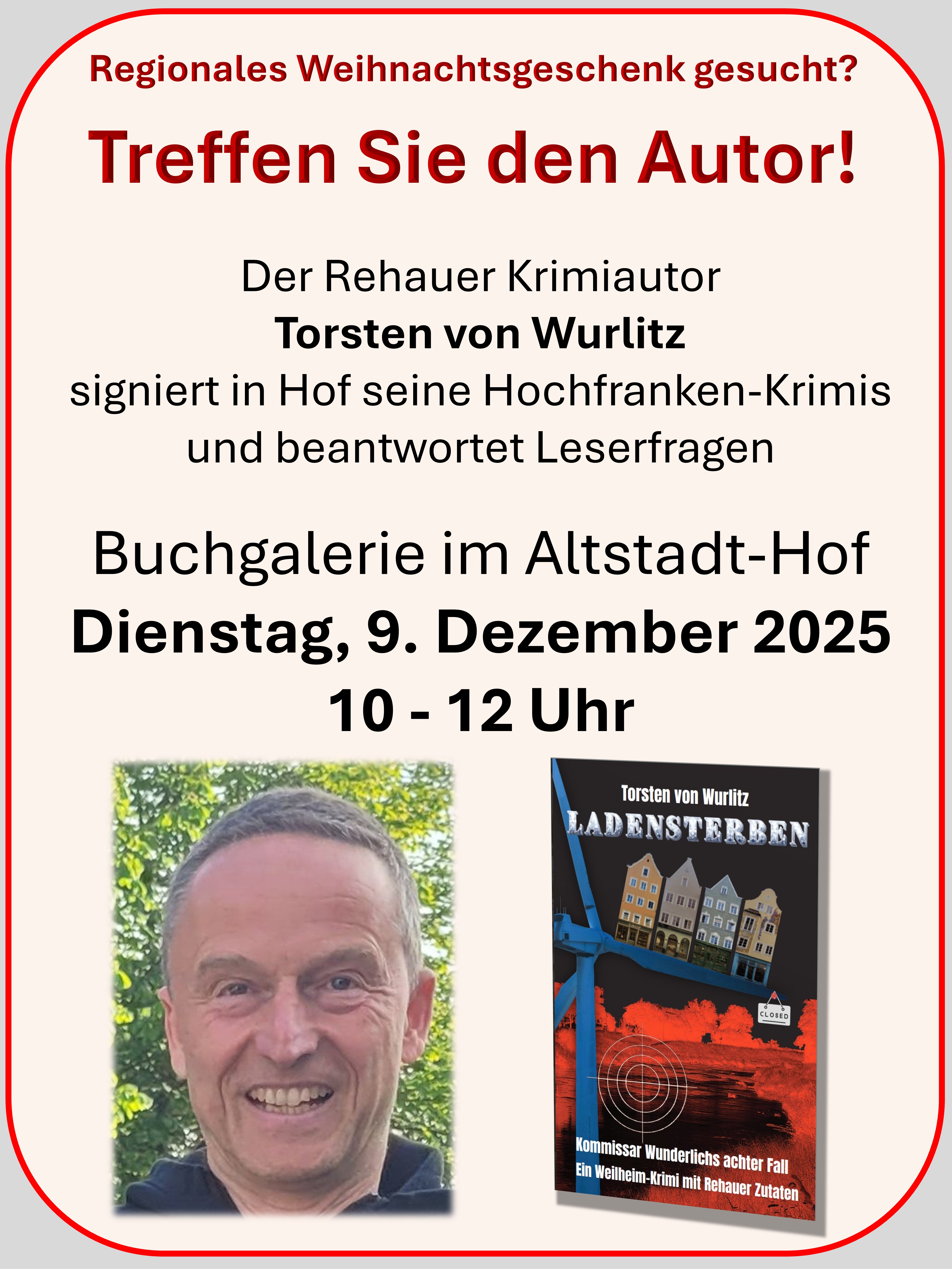 In seinem achten Fall verbindet Torsten von Wurlitz seine Heimatstadt Rehau erstmals ausführlich mit seinem langjährigen Wohnort Weilheim im bayerischen Voralpenland. „Den Pfaffenwinkel und Hochfranken eint, dass sie bayerische Regionen voller Liebenswürdigkeit und Lebensqualität sind“, betont der Autor, „und dafür sollte man mit breiter Brust Werbung machen.“ In „Ladensterben“ greift Torsten von Wurlitz dafür das Thema des starken Einzelhandels in den Innenstädten und dessen Vorteile für die Menschen und die Umwelt auf – umrahmt von Hochspannung, bei der wieder einmal nichts so ist, wie es am Anfang scheint.